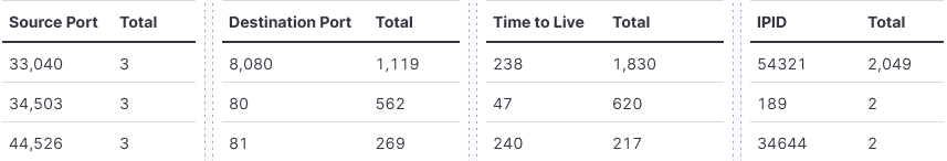 First, I’m going to look at some of the basic traffic collected by the honeypot using the firewall data. I’m going to set the time range to start at 7 days and select DShield – Traffic Analytic. My search is going to be simple, look for Source Port or IPID that could be associated with some tools that might be associated with potential reconnaissance captured by the firewall. Anything that is static with a high count might be something to use as a starting point (port equal to 0, IPID equal to 1, 54321, etc). In this case, I’m selecting IPID 54321 as a starting point.