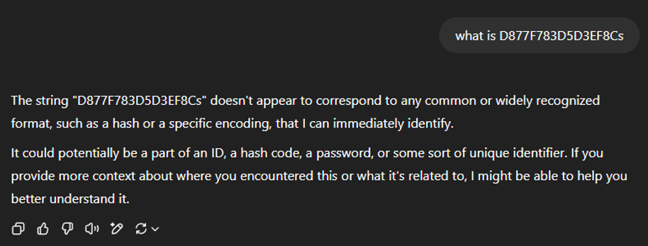 Figure 2: ChatGPT’s response to ‘What is D877F783D5D3EF8Cs’.