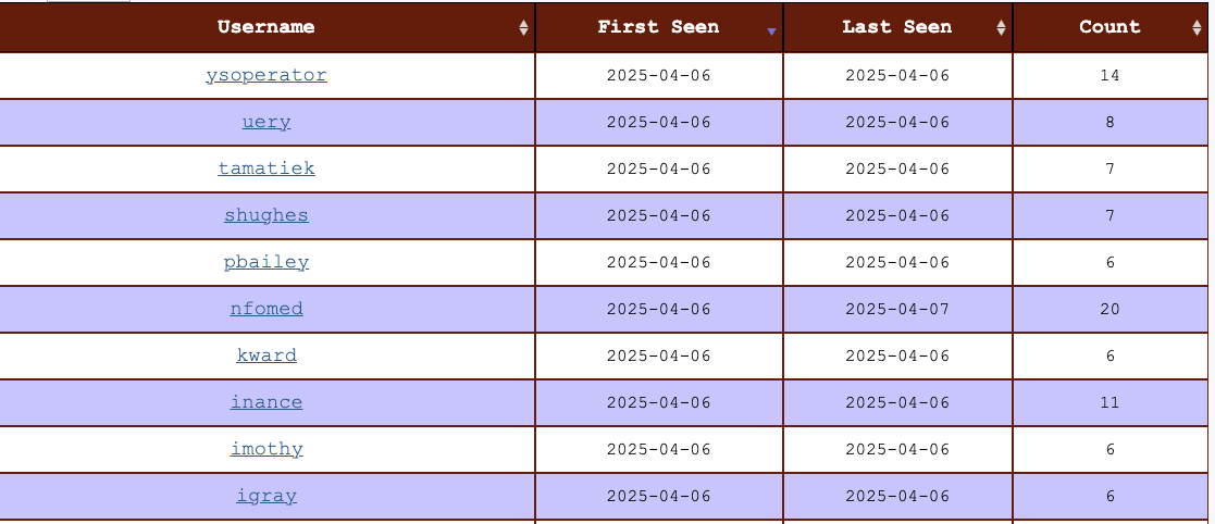 And there is one I think was funny: /usr/share/wordlists/logins.txt . Yes, the filename and path. I suspect the user didn’t know yet how to run the brute force script and passed the filename instead of the username. There are a few I consider typos: “atascientist” (I suspect “datascientist”), “ackupadmin” (backupadmin?). Could also be a tool that swallows the first letter of the username if the username is not provided correctly.