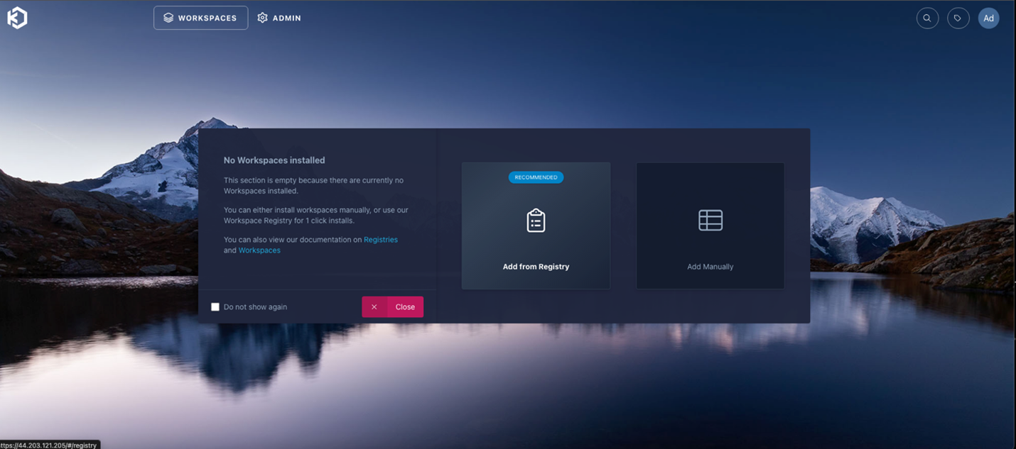 7. Once you’ve logged in, click the workspaces link on the left side of the screen and you’ll be presented with the below option. Kasm comes complete with a large variety of workspaces you can chose from. Select “Add from Registry” as seen in the screen shot below.