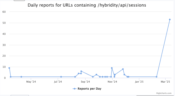 Today, I noticed increased scans for the VMWare Hyprid Cloud Extension (HCX) “sessions” endpoint. These endpoints are sometimes associated with exploit attempts for various VMWare vulnerabilities to determine if the system is running the extensions or to gather additional information to aid exploitation.