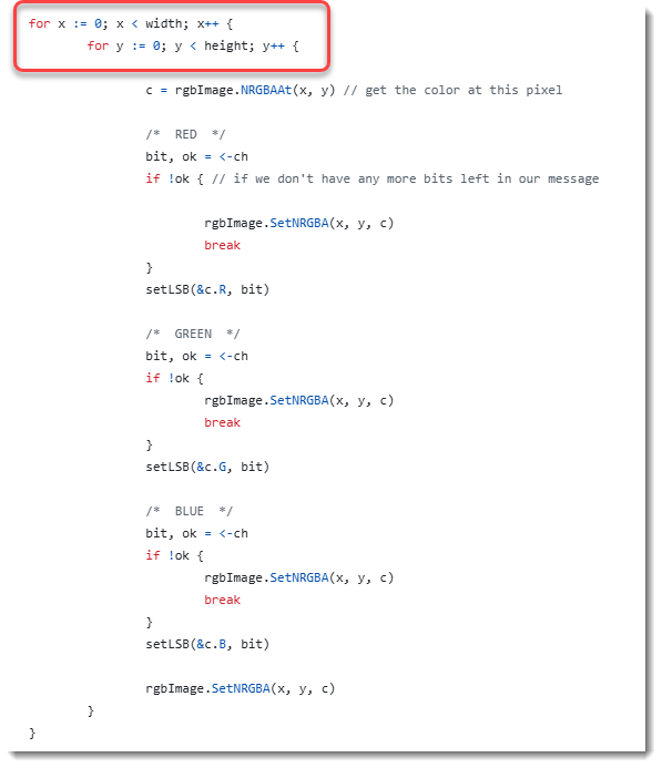 To encode each of the pixels, there are 2 nested for loops: “for x” and “for y”. This means that first the column is processed (y).